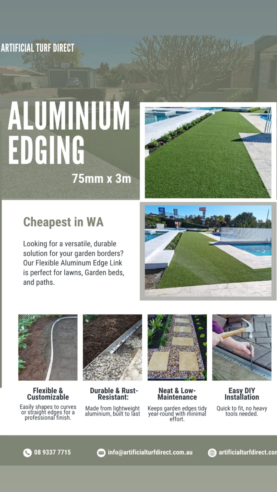 We offer a variety of materials that will help you increase the longevity and beauty of your Perth home or business artificial grass.